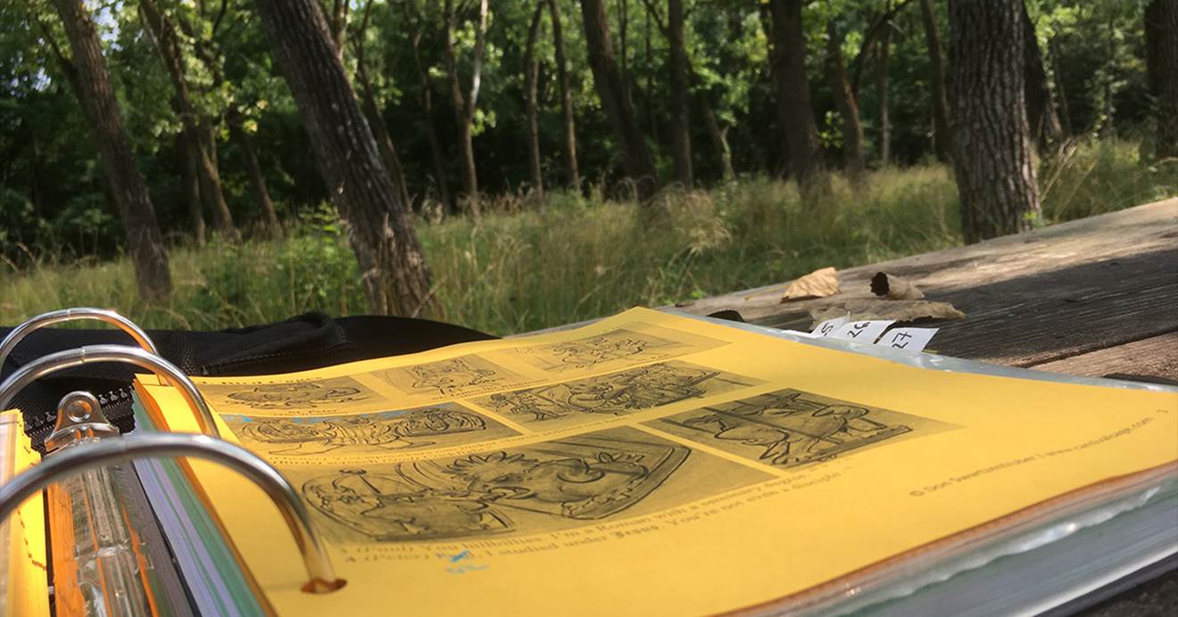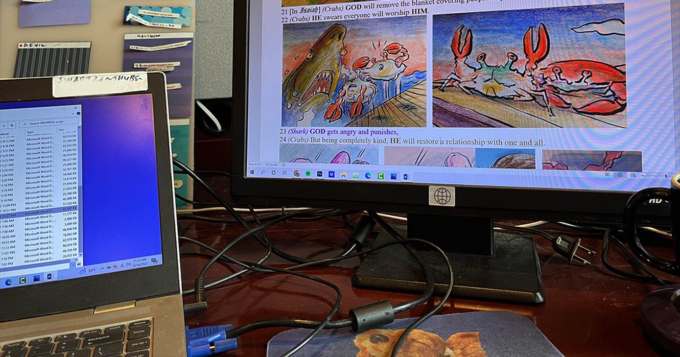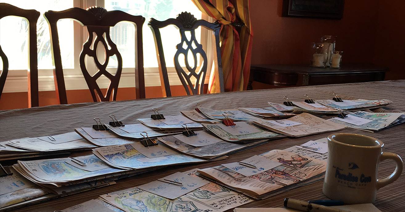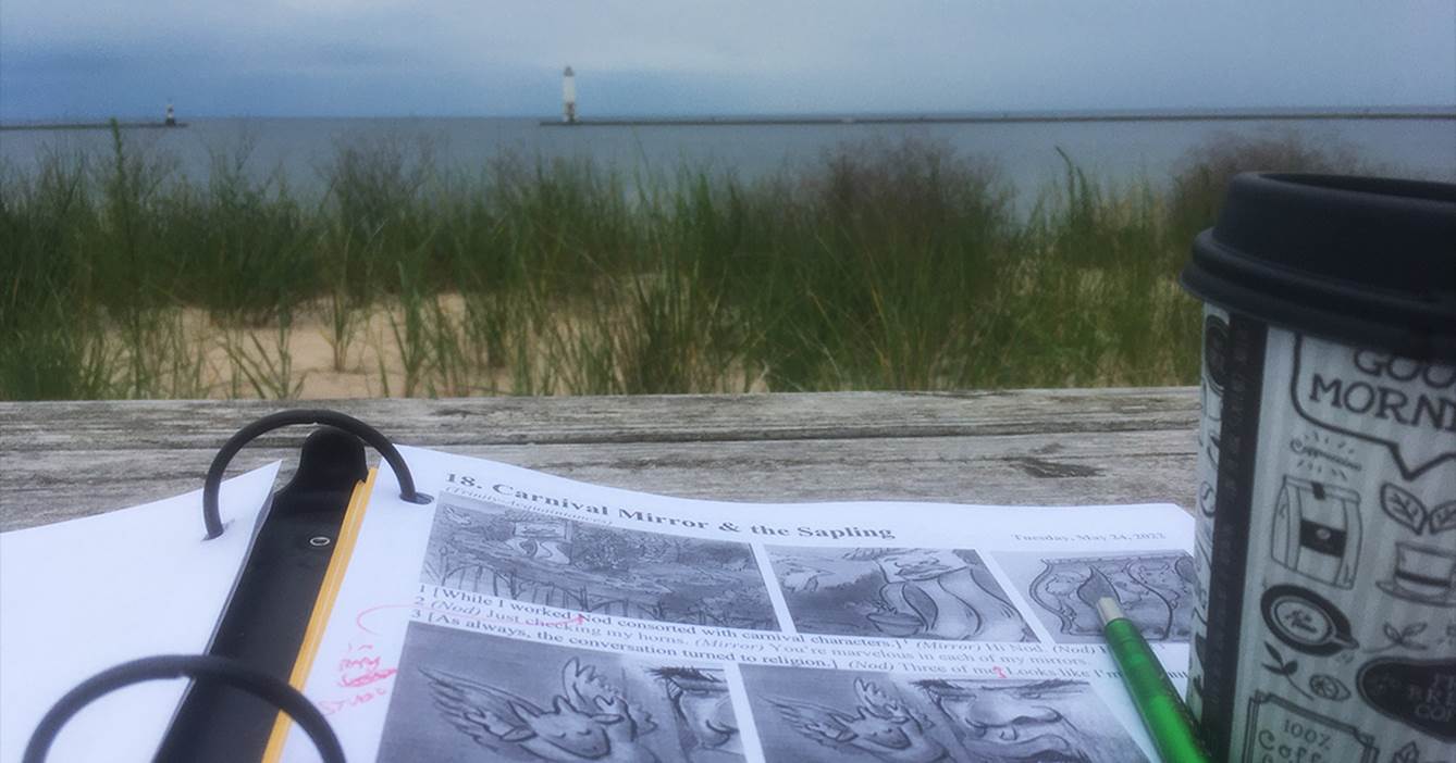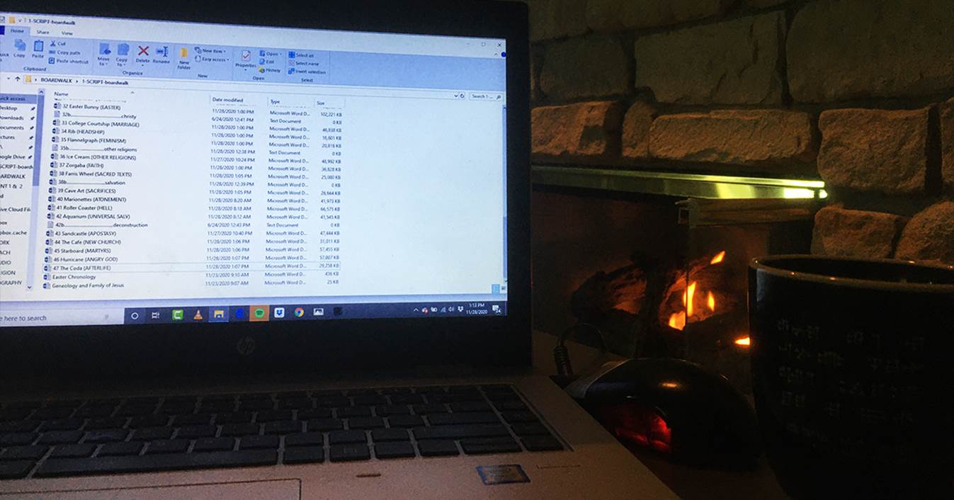 on scraps of paper, on my laptop, in a sketchbook, and in a script